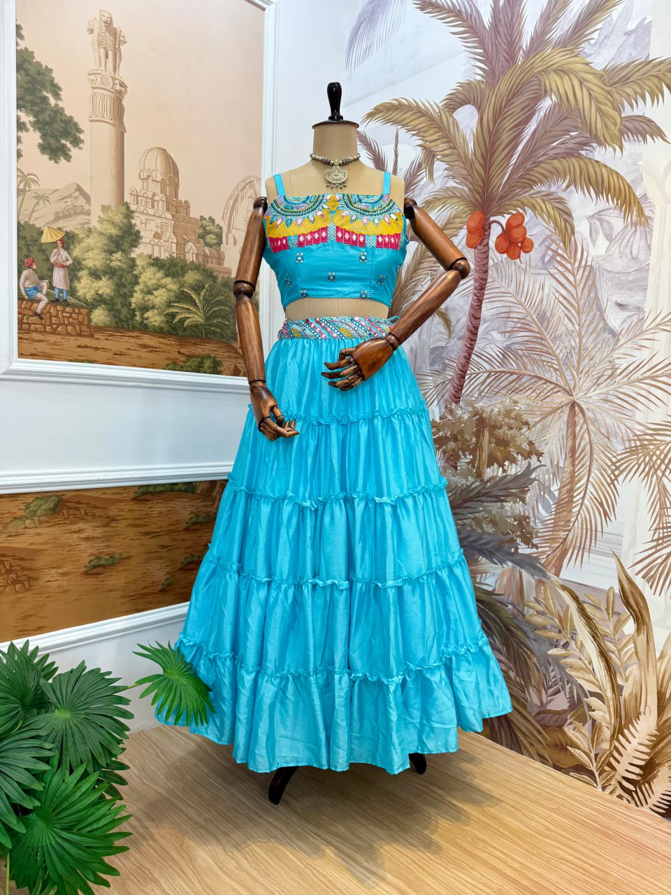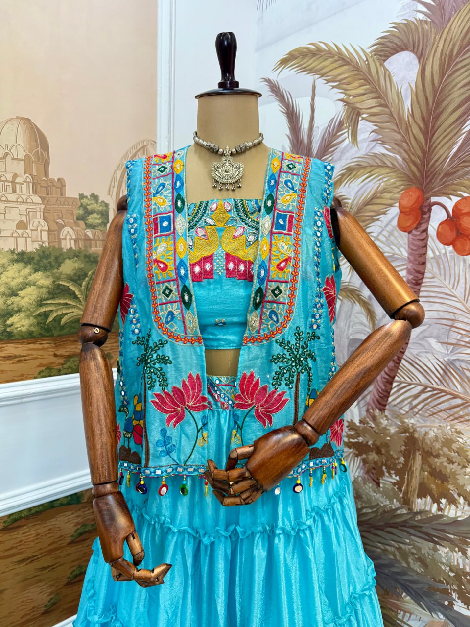 Attractive Sky Blue Chinon Embroidery Lehenga Choli With Koti