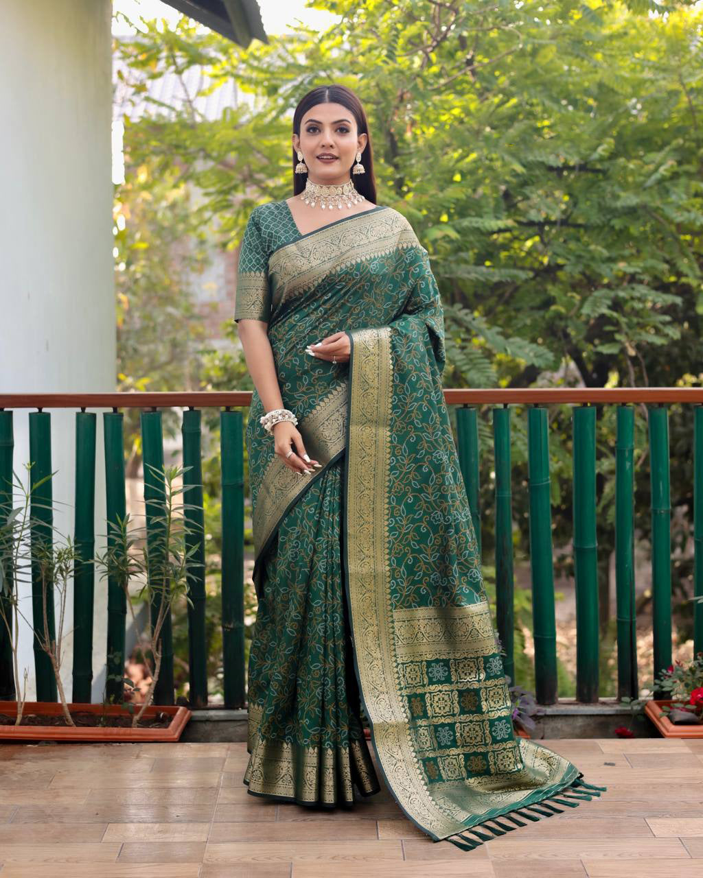 Saree Work Are Very Beautiful With kanchi Borders nd Contrast Zari Weaving borders, Saree has Bandhej Designed In All over zari Patola Weaving Concept with weaving Rich Pallu