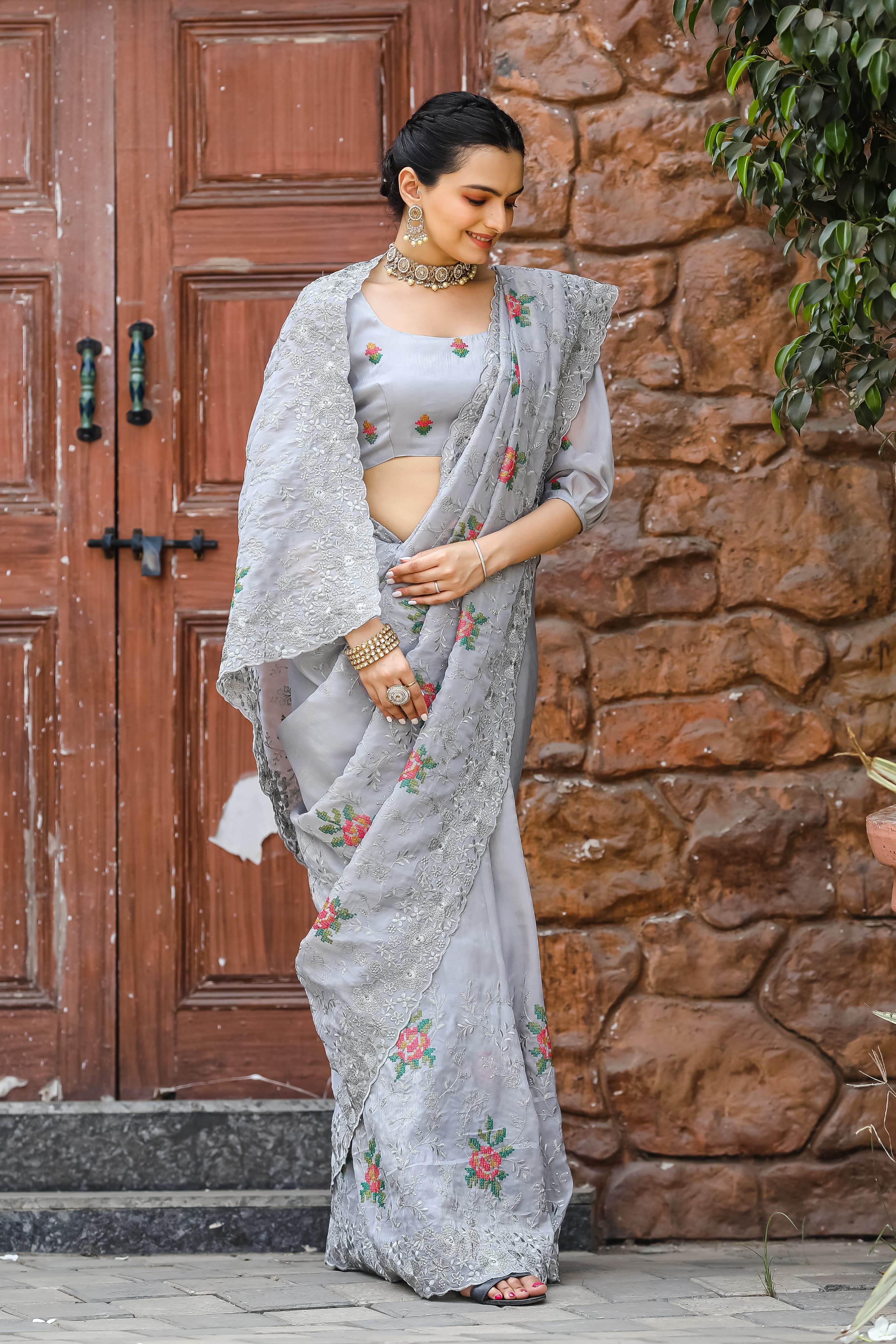 Ceremony Wear Zari Chiffon Grey Color Saree