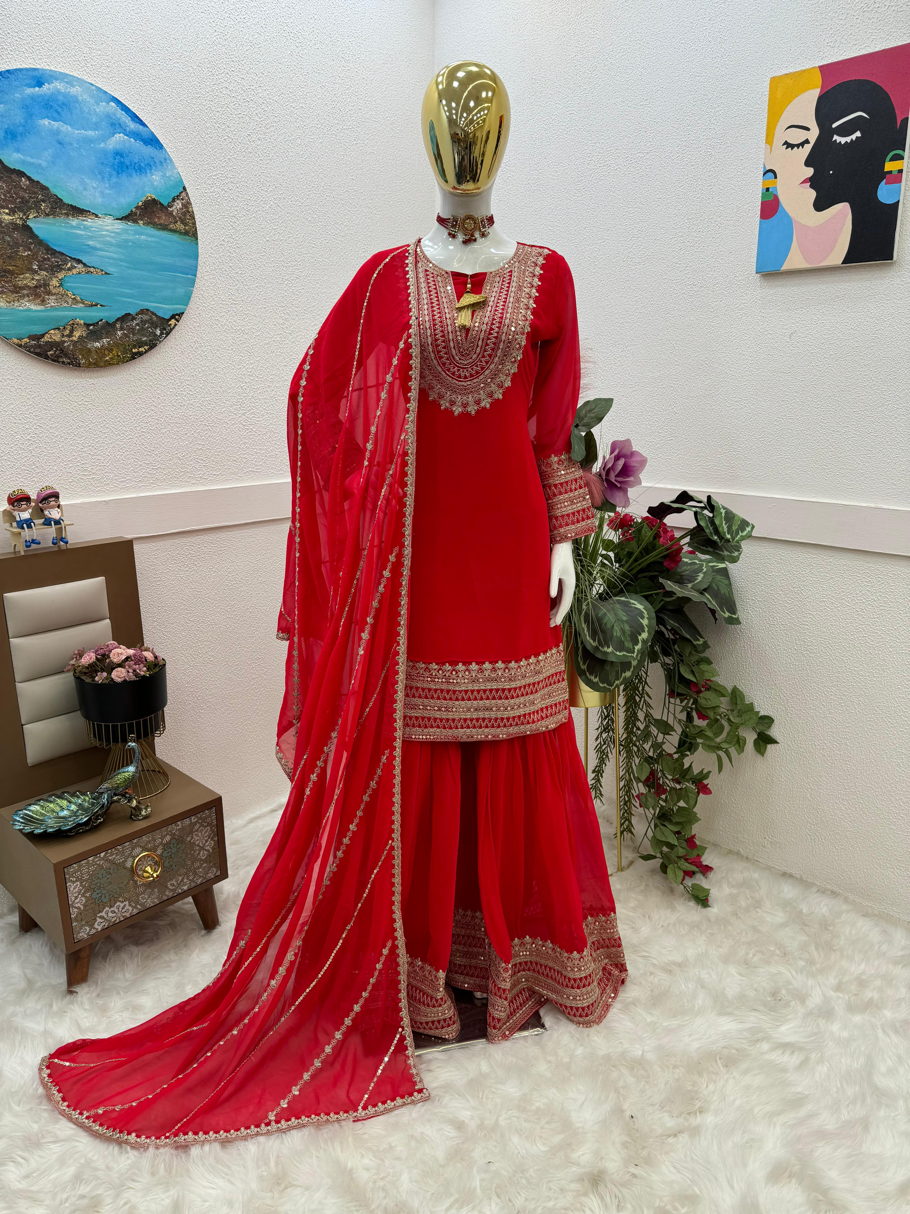 Glorious Coding Sequence Embroidery Red Color Sharara Suit