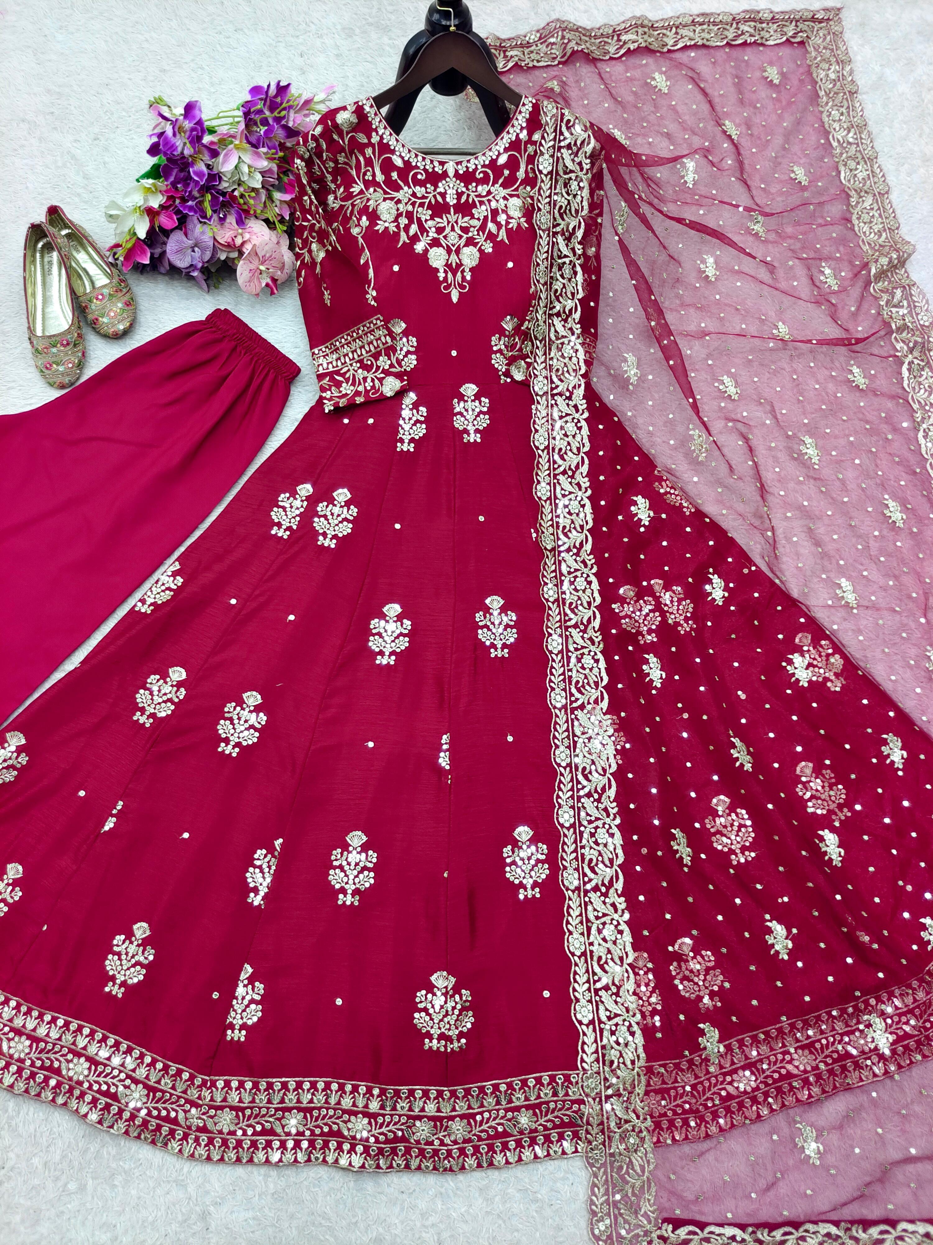 🩱Gown Fabric🩱: Pure Chinon Silk With Embroidery 5mm Sequins Work With Sleeves With (Front Back Side Full-Work)
