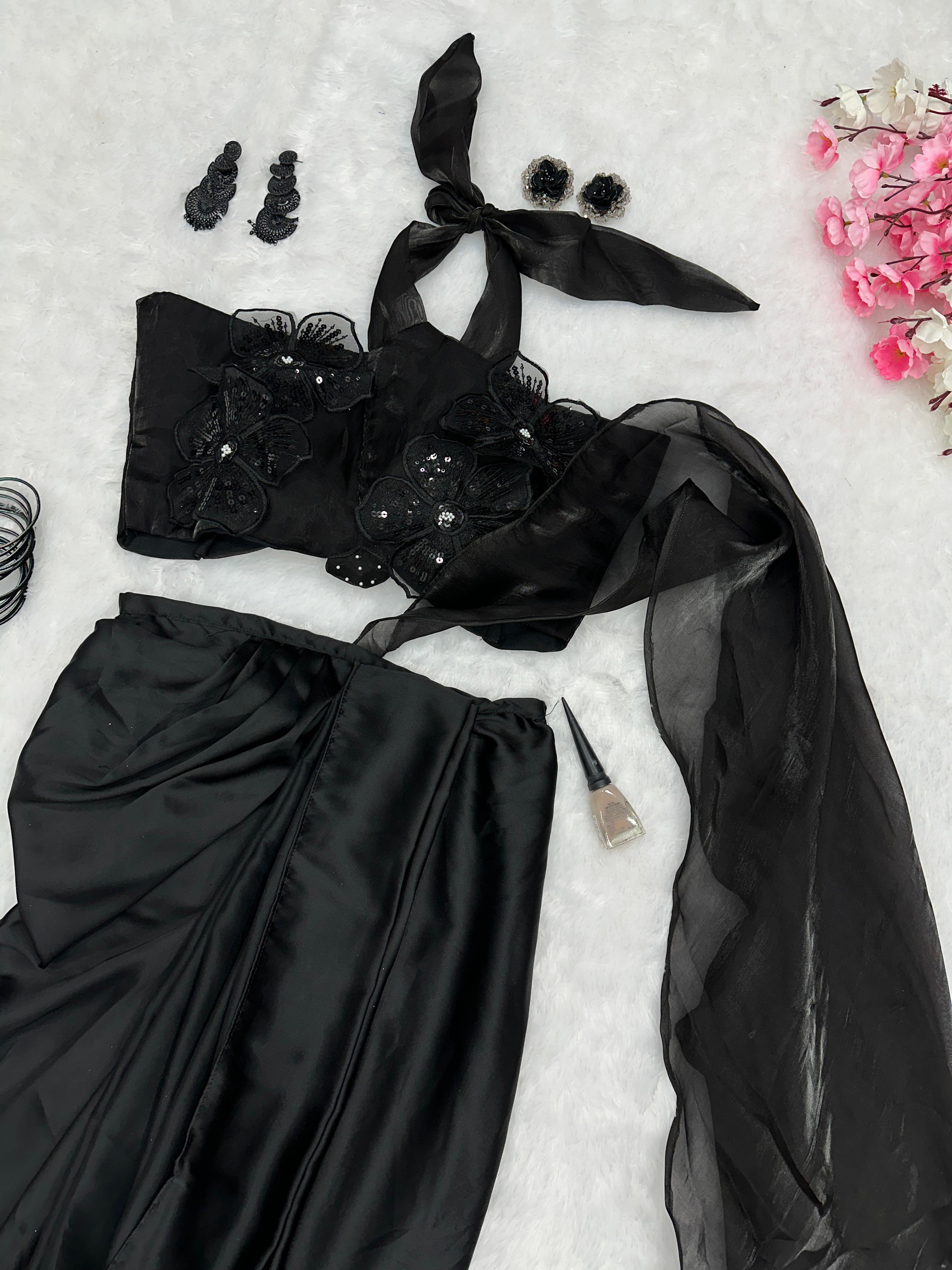 | Saree Fabric | Japan Satin Silk Ready To Wear Western Saree With Jimmy Choo Organza Pallu And Lace Detailing |