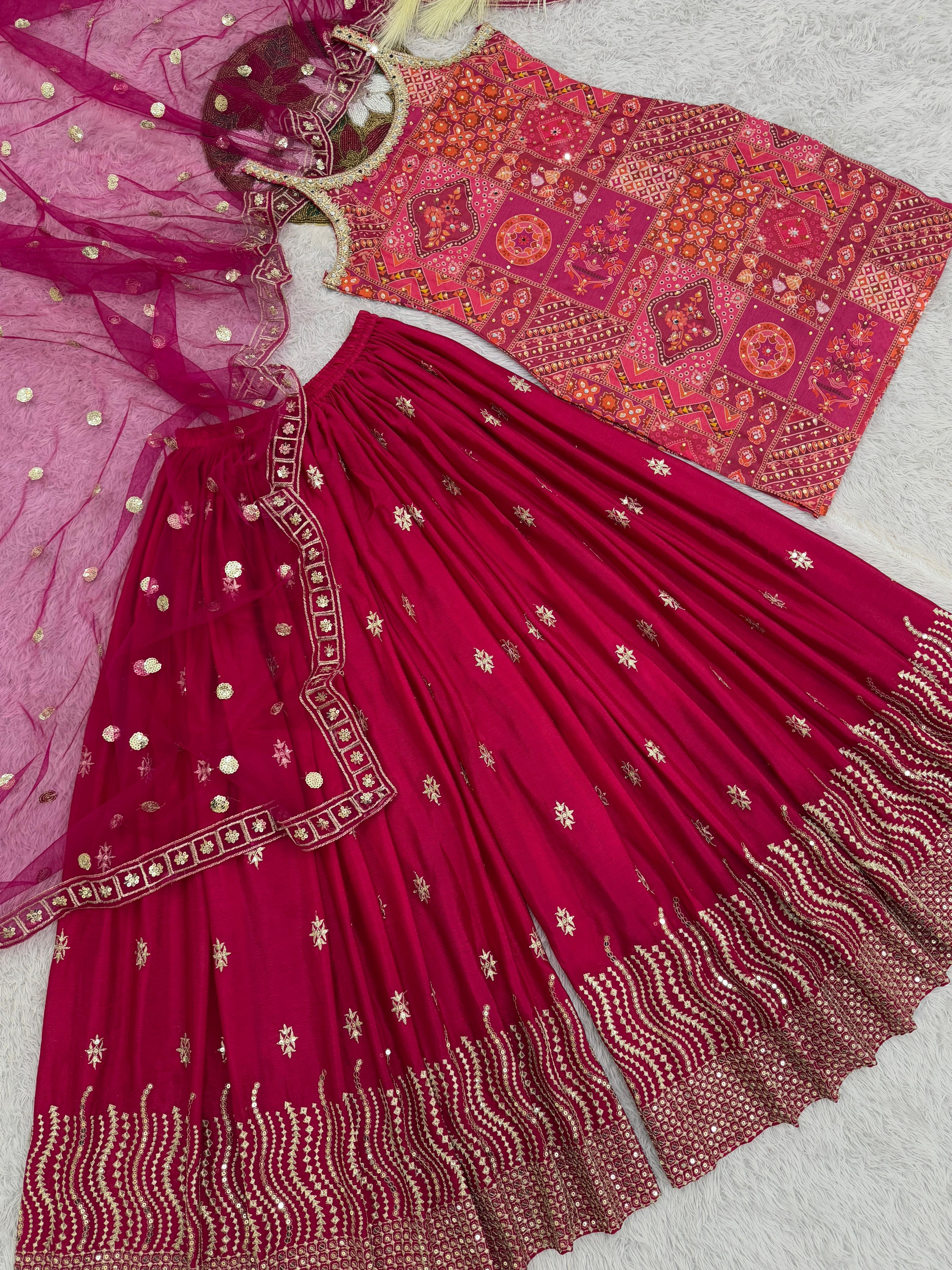 💥 Presenting New Digital Printed And Embroidery Sequence Worked Top-Palazzo And Dupatta Set Fully Stitched Ready To Wear 🔥😍🥰