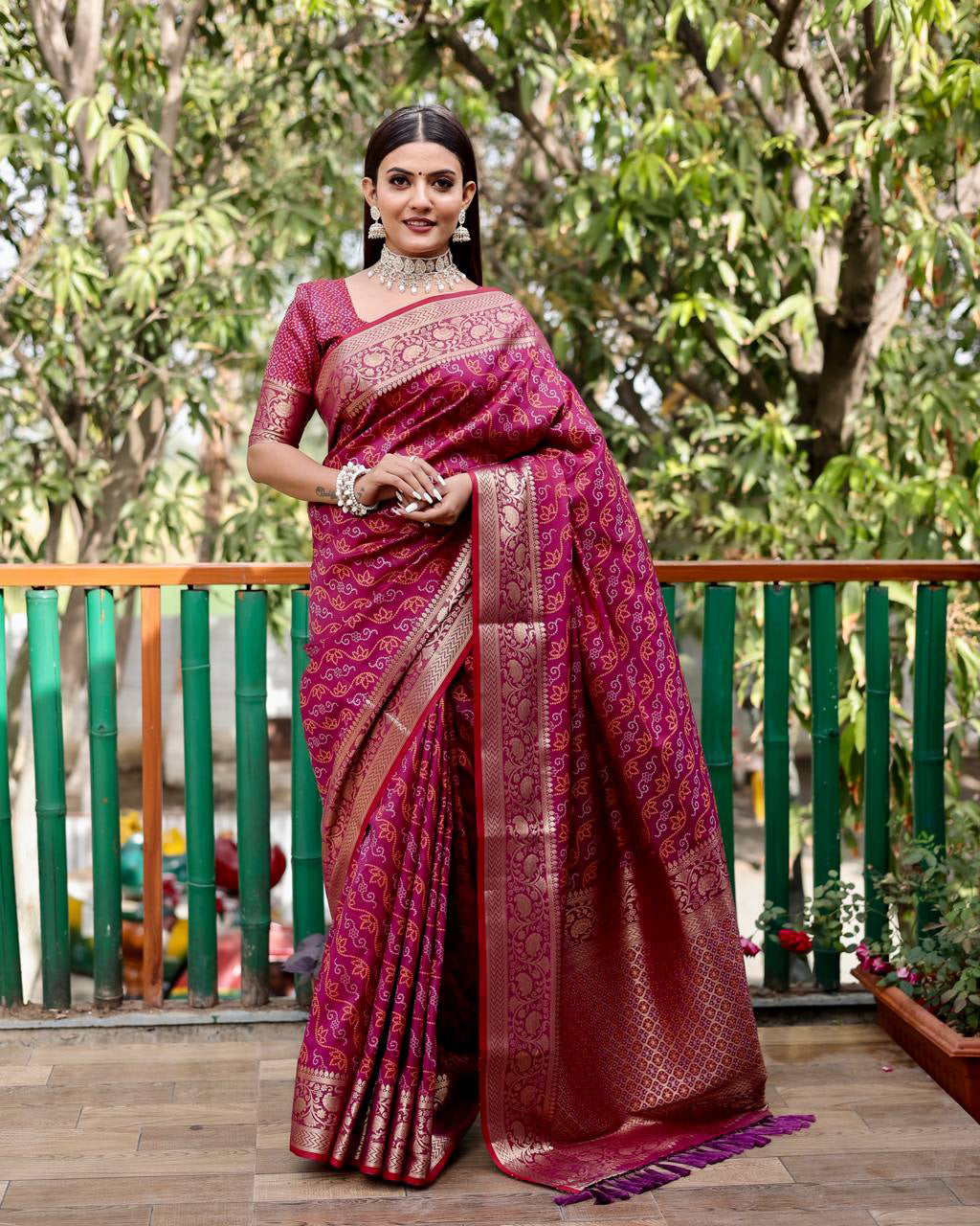 | Saree Work | Bandhej Designed In All over zari Patola Weaving Concept with weaving Rich Pallu, Extra Elegance added With Borders _Kanchi |